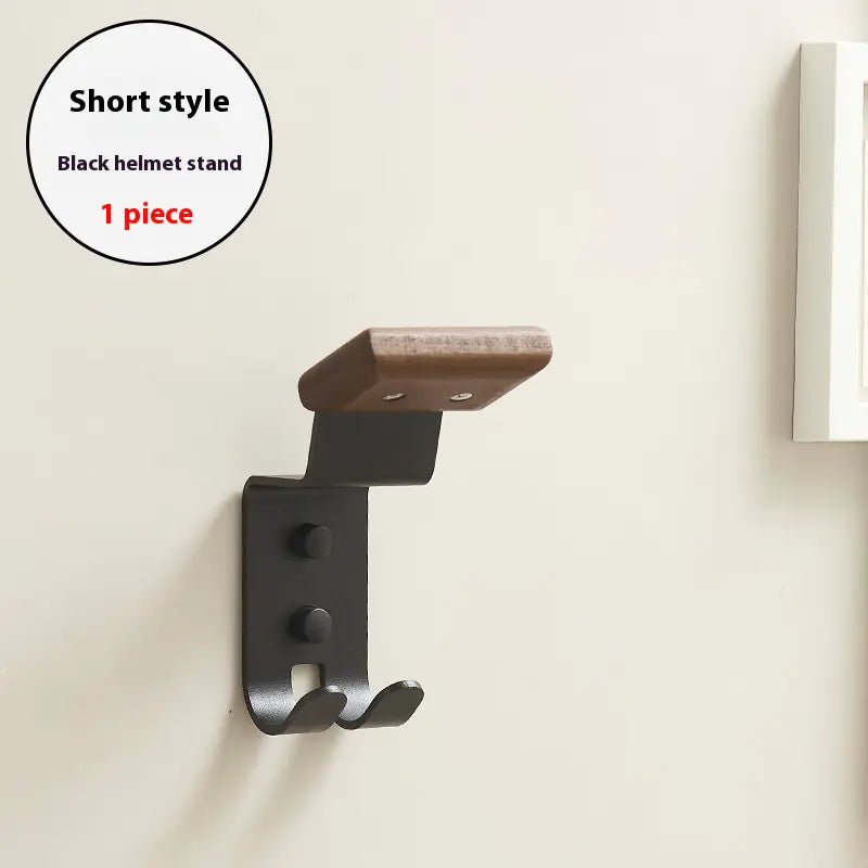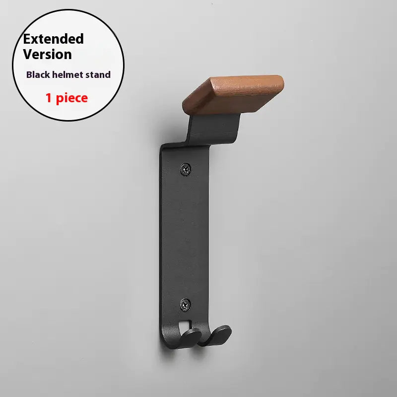 Wall-mounted aluminum alloy helmet and hat rack for storage and display. Sturdy 10kg load, wooden beech base, available in short or lengthened styles. Easy installation, suits living rooms or garages.